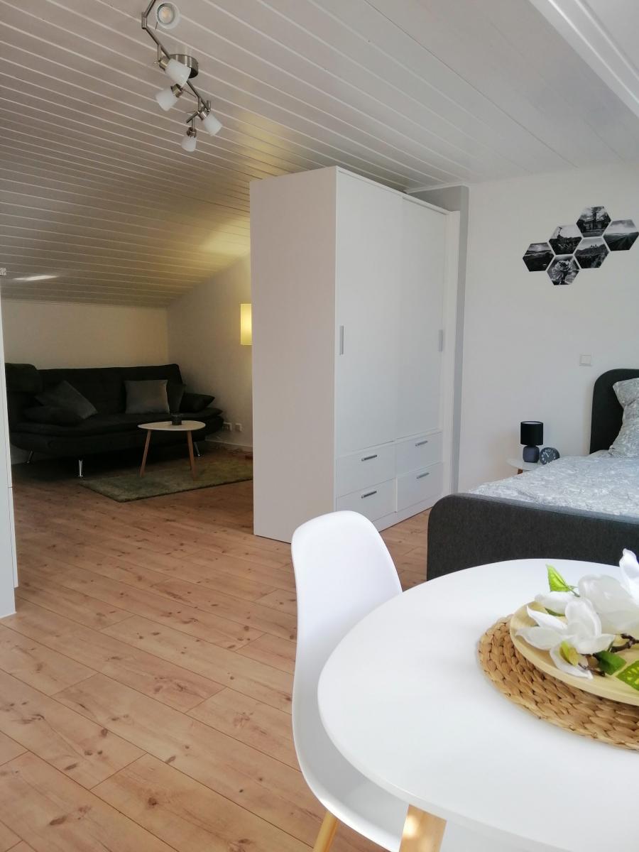 Der Schlafbereich, Essbereich, Wohnbereich befindet sich zusammen mit der Küchenzeile in einem Raum.