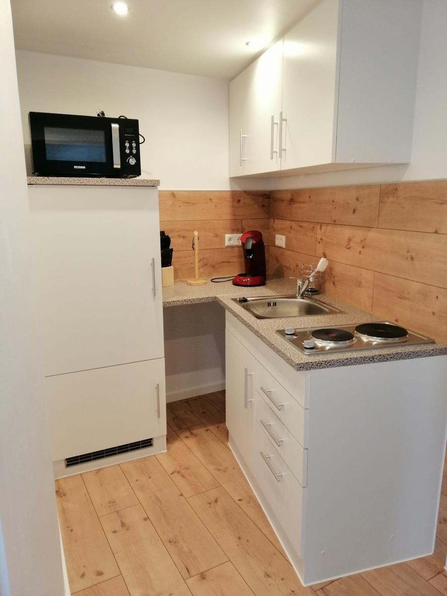 Kühlschrank, Herd, Senseo-Kaffeemaschine, Wasserkocher, Toaster, Mikrowelle mit Heißluftfunktion, Geschirr, Besteck, Gläser, Küchenutensilien, Geschirrhandtücher, Spülmittel, Spülschwamm